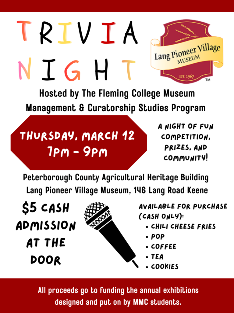 Enjoy an evening of friendly competition and fun with Trivia Night hosted by the Fleming College Museum Management and Curatorship Studies Program. Admission is $5 at the door, with proceeds supporting the annual exhibitions designed and implemented by MMC students. Chili cheese fries, pop, coffee, tea, and cookies will be available for purchase at the event. Please note: this is a cash-only event, so be sure to come prepared!This event takes place in the Peterborough County Agricultural Heritage Building at 146 Lang Road.